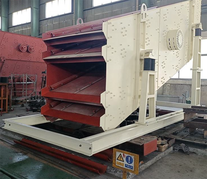 在石英砂生產(chǎn)流程中,原礦首先經(jīng)破碎、制砂處理后進(jìn)入篩分工序。石英砂由皮帶機(jī)輸送至圓振動篩給料口,在偏心激振力作用下,篩箱作圓周運(yùn)動,石英砂在篩面上篩面上拋起、擴(kuò)散。篩分后的粗顆粒、細(xì)顆粒等石英砂可以在篩網(wǎng)下方配皮帶機(jī),然后不同的皮帶機(jī)將不同粒徑的石英砂送到不同的生產(chǎn)環(huán)節(jié),實(shí)現(xiàn)連續(xù)性的生產(chǎn)流程。